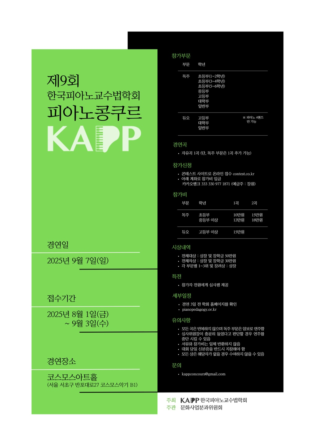 제9회 한국피아노교수법학회 피아노 콩쿨이 9월 7일에 개최됩니다.